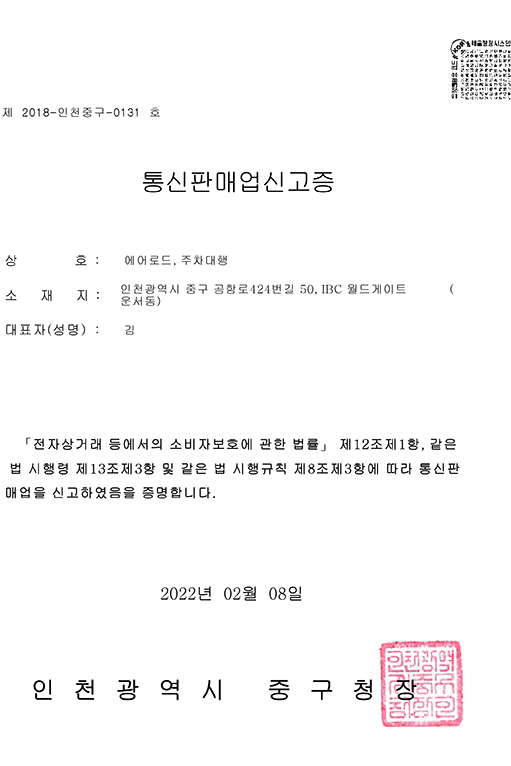 | 통신판매업신고번호 | 제 2018-인천중구-0131호 |